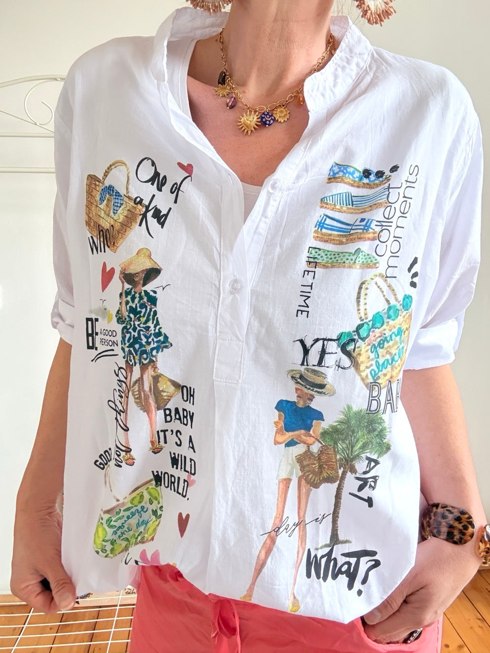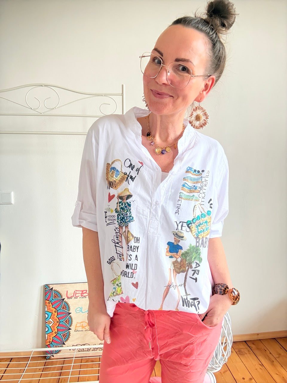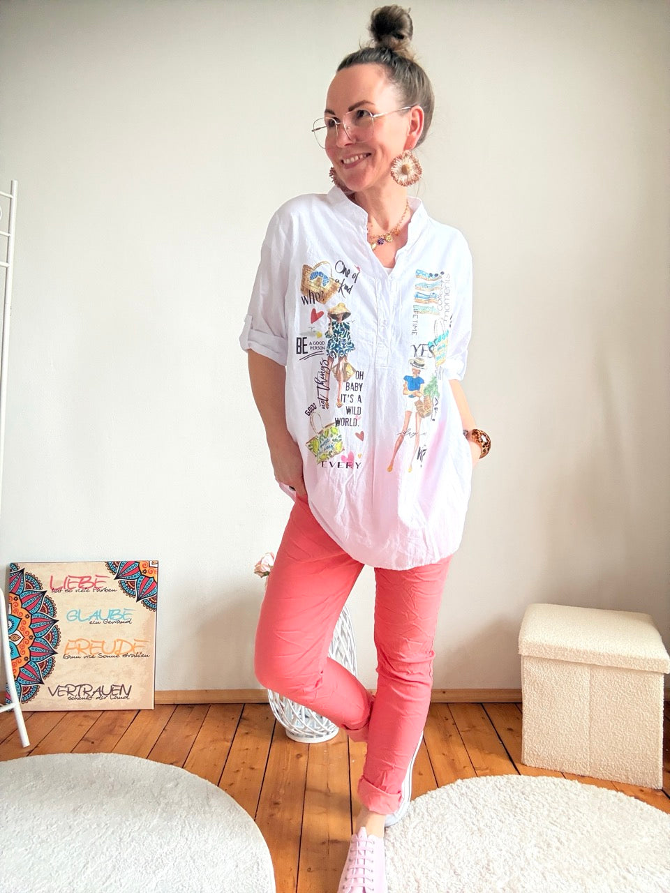 • Tolle lange Bluse in Weiß mit buntem Print