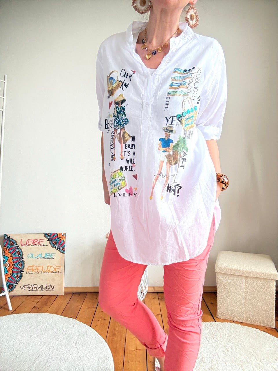 • Tolle lange Bluse in Weiß mit buntem Print