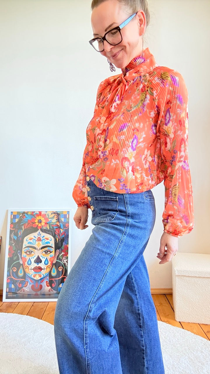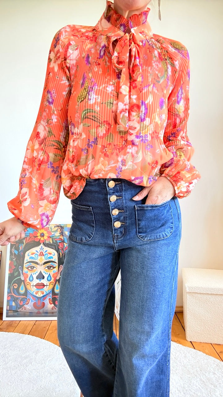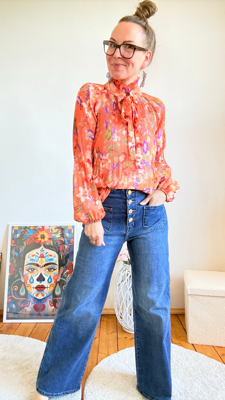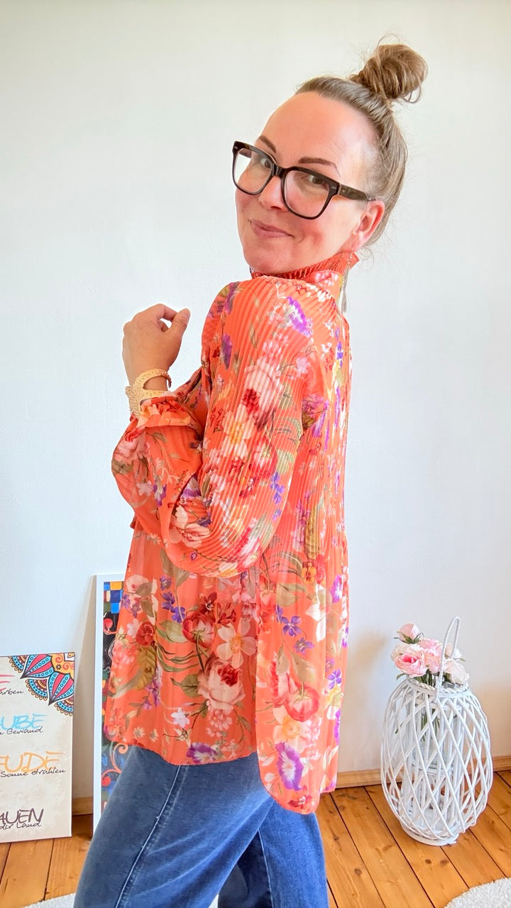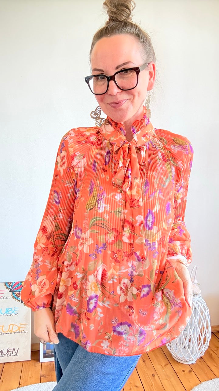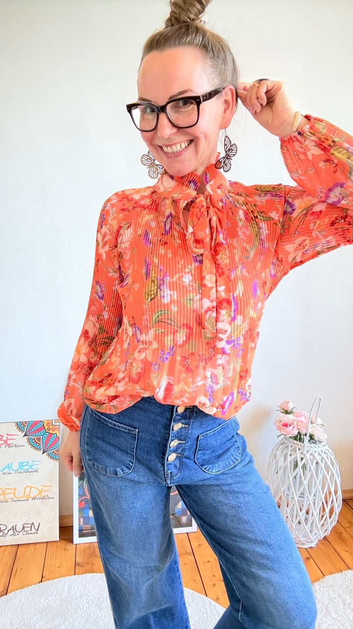 - Wunderschöne, leichte Plissee Schluppen Bluse im Stil der 20er Jahre, mit Blütenmuster in Orange