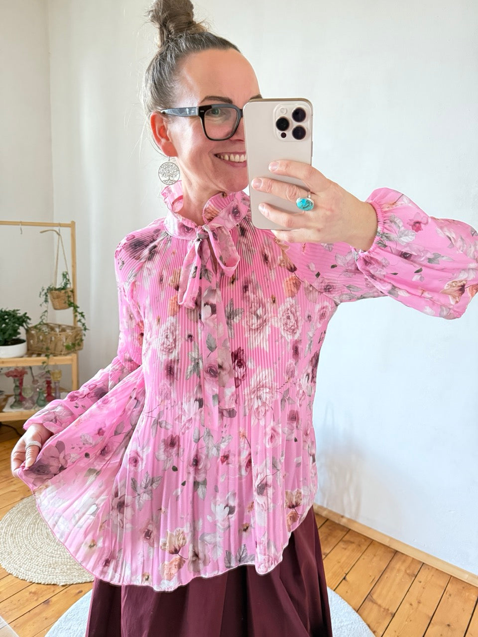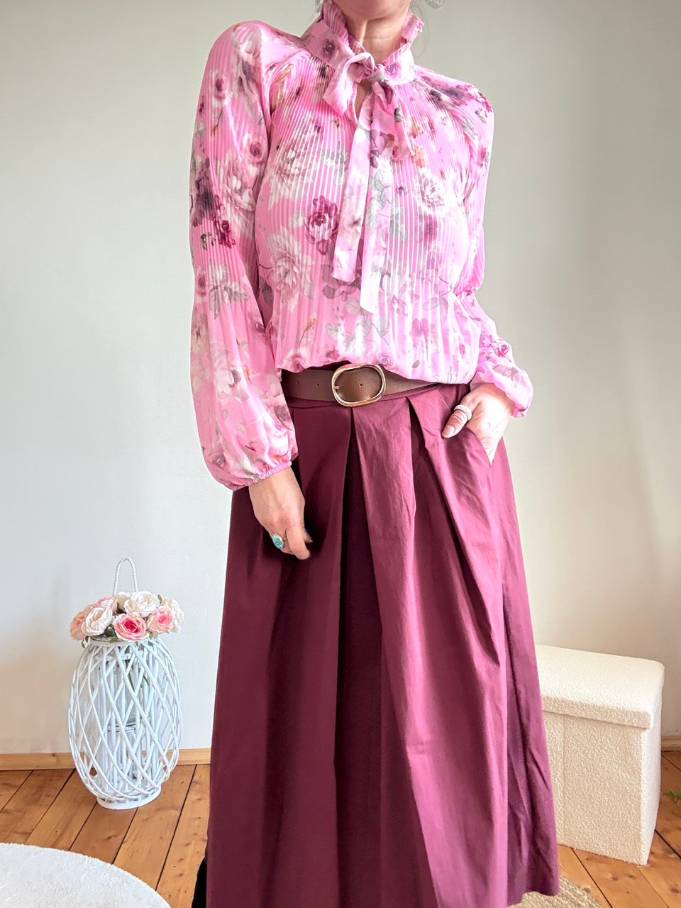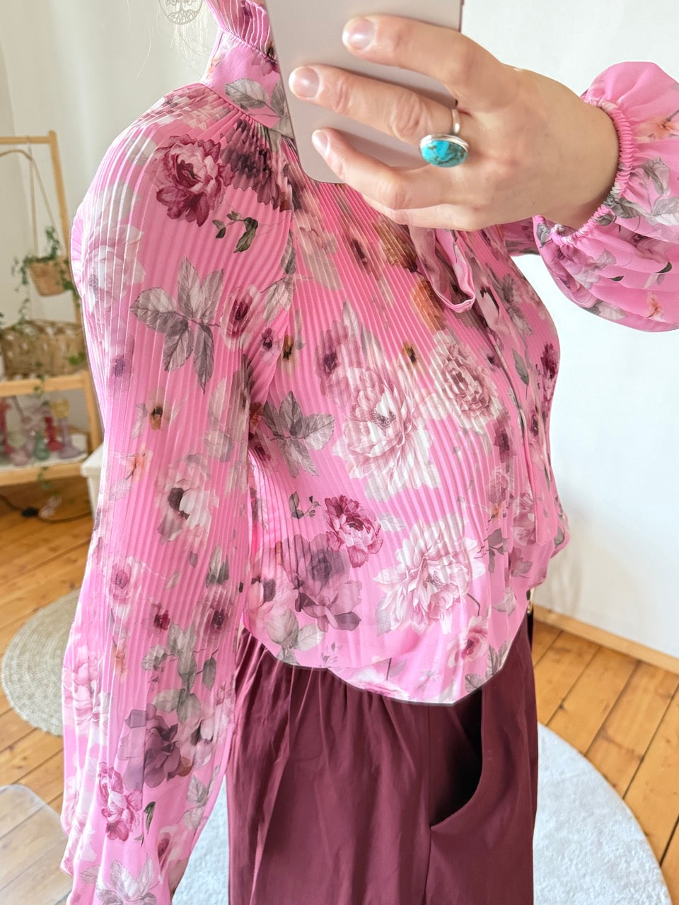 - Wunderschöne, leichte Plissee Schluppen Bluse im Stil der 20er Jahre, mit Rosenmuster in Rose