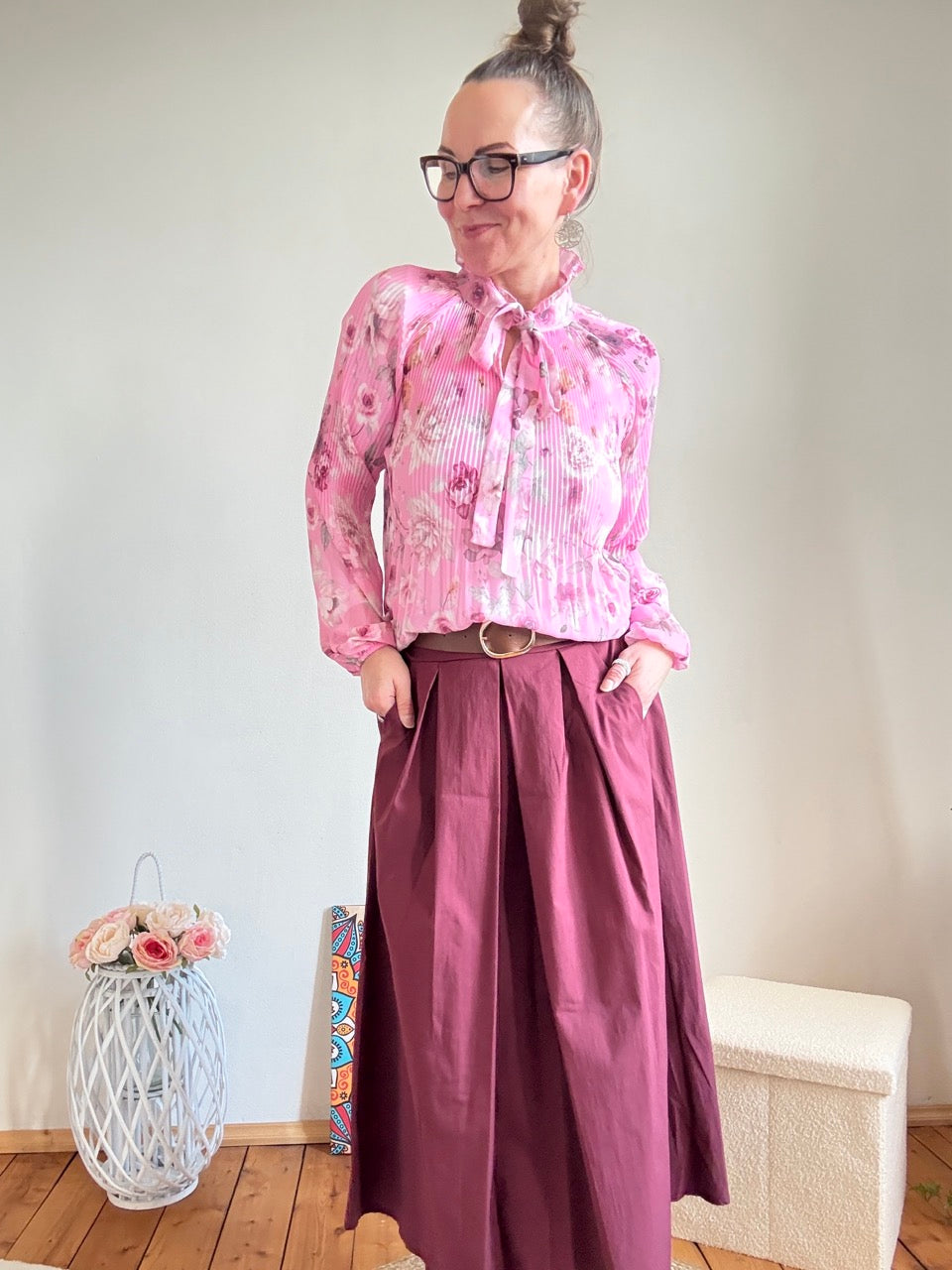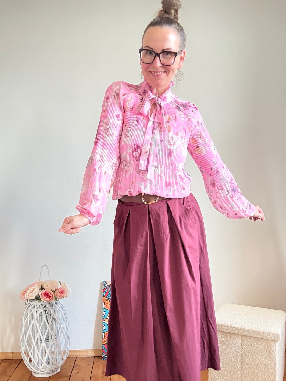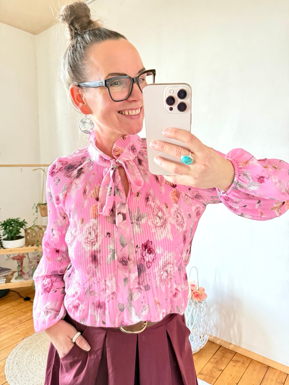 - Wunderschöne, leichte Plissee Schluppen Bluse im Stil der 20er Jahre, mit Rosenmuster in Rose