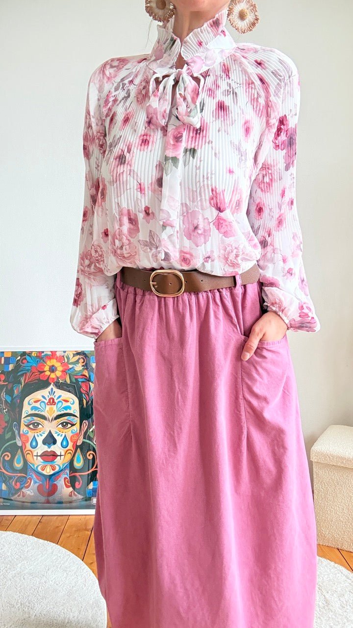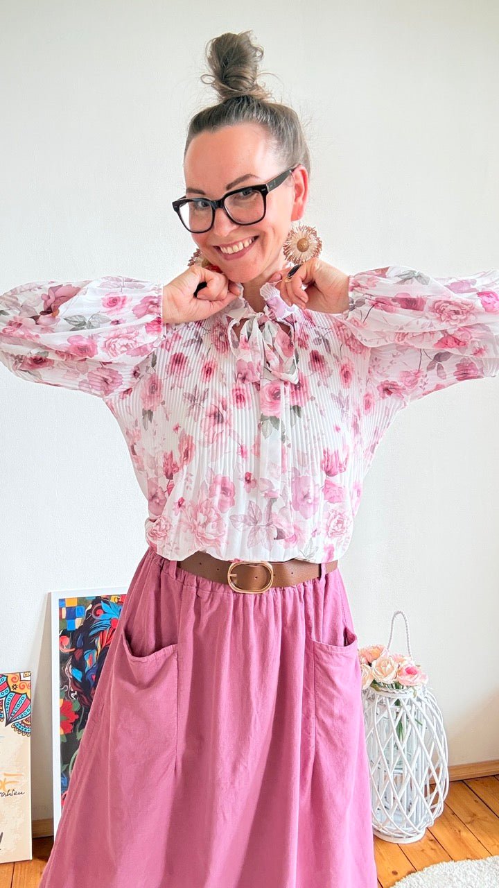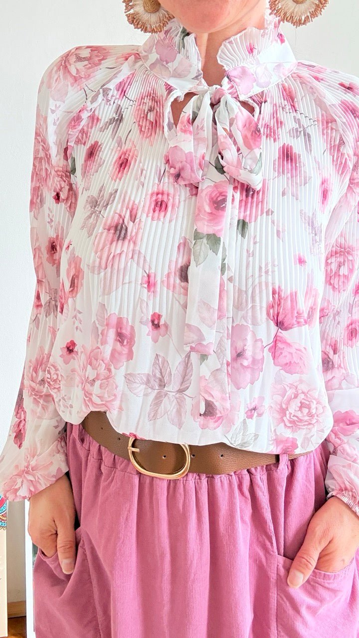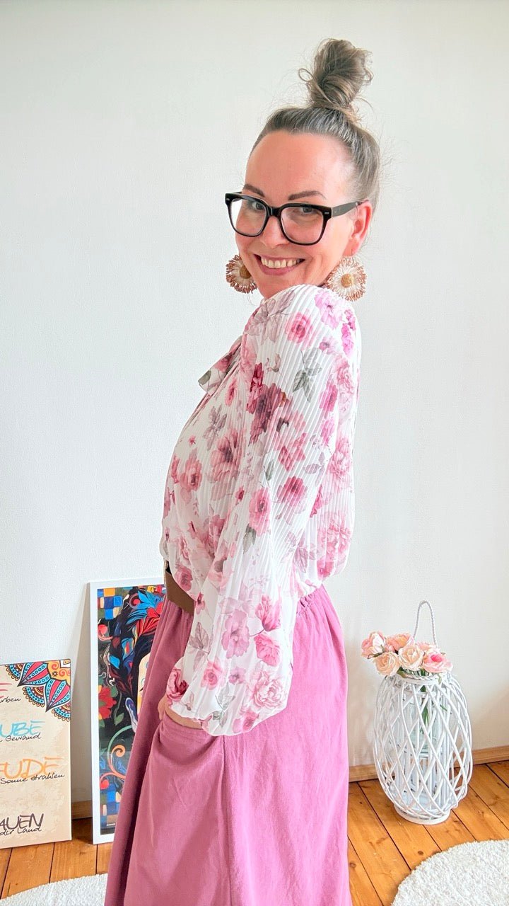 - Wunderschöne, leichte Plissee Schluppen Bluse im Stil der 20er Jahre, mit Rosenmuster Weiß